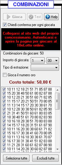 "Elenco combinazioni": viene visualizzato l'elenco delle combinazioni da giocare online. Per escludere una combinazione dal gioco online eliminare il segno di spunta a sinistra della combinazione. Saranno giocate solo le combinazioni che hanno il segno di spunta.