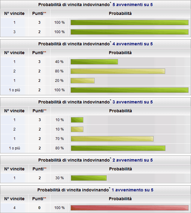 Poichè il pronostico è composto da 5 avvenimenti, sarà possibile realizzare massimo 5 avvenimenti vincenti.