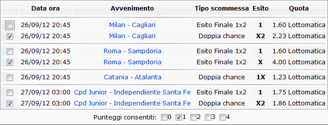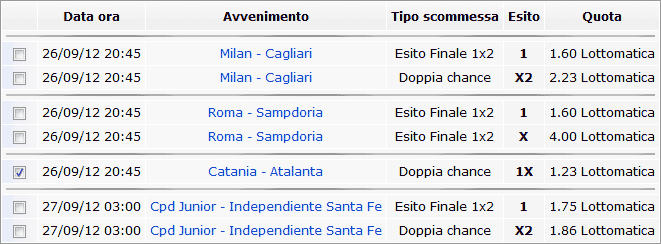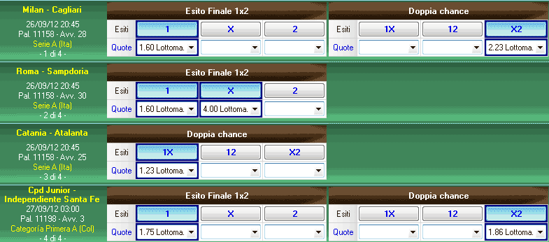 La seconda condizione è rappresentata da una scommessa fissa così come mostrato in figura. Nello specifico si è deciso che nelle scommesse finali potrà comparire un solo esito tra i 3 seguenti: Milan - Cagliari X2, Roma - Sampdoria X e Cpd - S. Fe X2. |