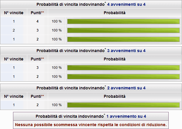 Nell'immagine a destra viene mostrato il risultato del calcolo della probabilità di vincita che è stato eseguito impostando il metodo di sviluppo su "Considera le condizioni di riduzione". Indovinando 2 3 o 4 avvenimenti su 4 (e indovinando le condizioni) si realizzerebbero al 100% delle scommesse vincenti.