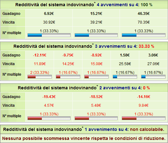 Come mostrato il sistema è redditizio al 100% (vincita totale maggiore della spesa totale) solo quando si indovinano 4 avvenimenti su 4. Negli altri casi non viene garantito al 100% un guadagno positivo.