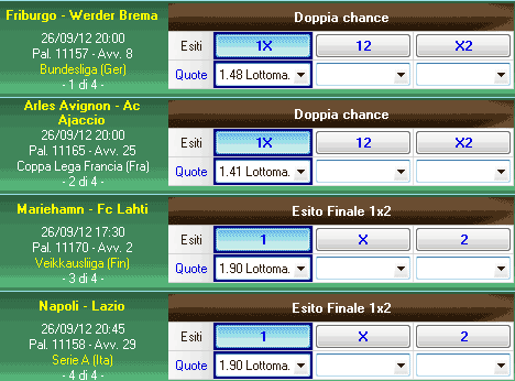 Si prenda in considerazione il pronostico iniziale mostrato nell'immagine. E' composto da 4 esiti appartenenti a 4 diversi avvenimenti, due "doppia chanche 1X" e due "esito finale 1".