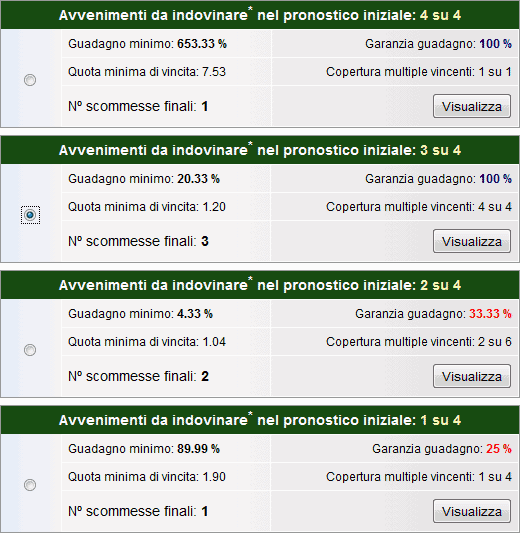 L'immagine a sinistra visualizza i risultati mostrati dalla riduzione a guadagno garantito. Vengono mostrate 4 tabelle una per ogni punteggio realizzabile nel pronostico iniziale (da 1 a 4 esiti).
