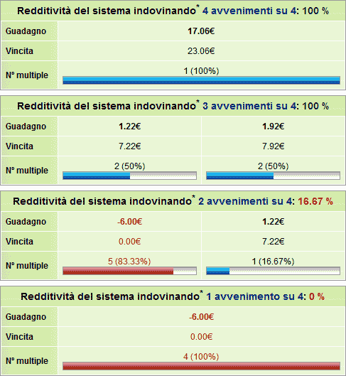 Come mostrato nella seconda tabella relativa ai 3 punti su 4 (indovinando 3 avvenimenti su 4) la redditività del sistema è garantita al 100%. In questo caso giocando 6 euro la vincita minima sarebbe di 7,22 euro e massima di 7,92 con relativo guadagno minimo di 1,22 euro e guadagno massimo di 1,92 euro.