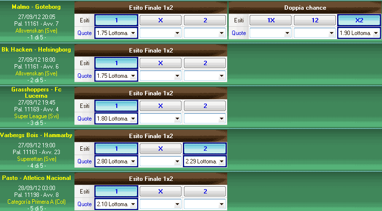 Si prenda in considerazione il pronostico iniziale mostrato nell'immagine composto da 7 esiti in 6 scommesse appartenenti a 5 diversi avvenimenti.