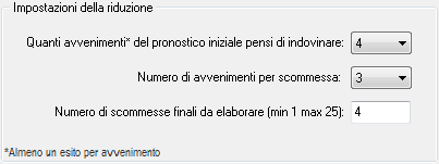 Nella scheda "Metodi di riduzione" è stata selezionata la "Riduzione a massima rappresentatività" lasciando disattivata la riduzione condizionata (al pronostico non è stata applicata nessuna condizione). Nella scheda relativa alla riduzione sono stati impostati 4 avvenimenti da indovinare, scommesse composte da 3 esiti e 4 scommesse finali.