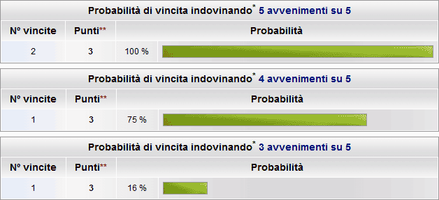Come mostrato nella seconda tabella relativa ai 4 punti su 5 (indovinando 4 avvenimenti su 5) la probabilità di realizzare una scommesse vincenti è del 75% (più di 7 possibilità su 10). |