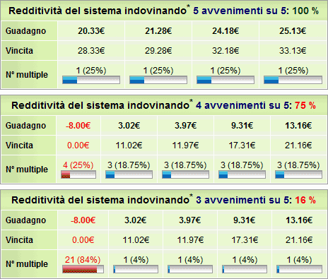 Come mostrato nella seconda tabella relativa ai 4 punti su 5 la probabilità che il sistema sia redditizio (vincita totale superiore della spesa totale) è del 75% (75 possibilità su 100).