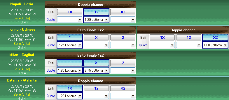 Si prenda in considerazione il pronostico iniziale mostrato nell'immagine composto da 6 esiti appartenenti a 4 diversi avvenimenti.