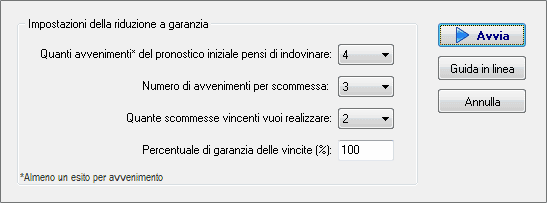 Nella scheda "Metodi di riduzione" è stata selezionata la "Riduzione a punteggio garantito" lasciando disattivata la riduzione condizionata (al pronostico non è stata applicata nessuna condizione).