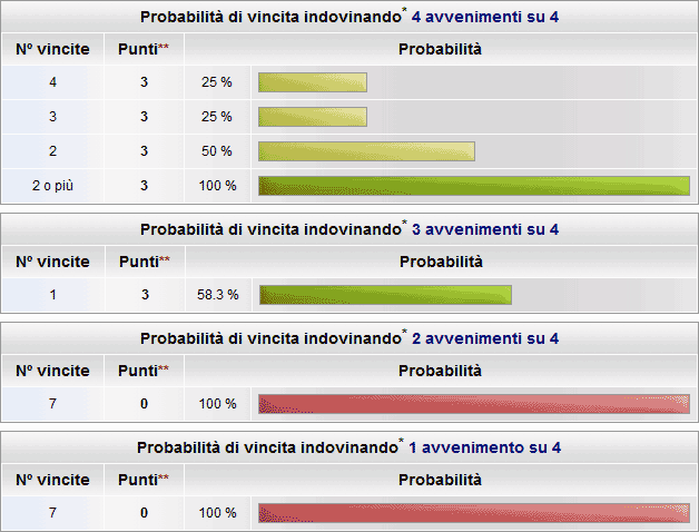 Come mostrato nella prima tabella relativa ai 4 punti su 4 (indovinando 4 avvenimenti su 4) la probabilità di realizzare due o più scommesse vincenti composte da 3 esiti è del 100%. In particolare si hanno 25 di probabilità di realizzare 4 scommesse vincenti da 3 esiti, 25% di realizzarne 3 e 50% di realizzarne 2.