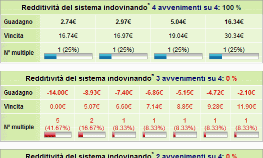 Come mostrato nella prima tabella (indovinando 4 avvenimenti su 4) anche la redditività del sistema è garantita al 100%. Giocando 14 euro si avrebbe un guadagno compreso tra 2.74 euro e 16.34 euro con vincita totale compresa tra 16.74 euro e 30.34 euro.