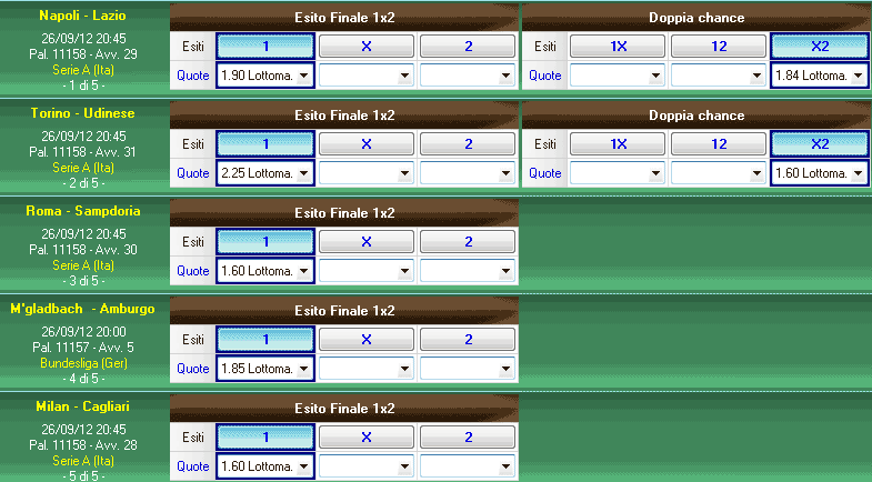 Si prenda in considerazione il pronostico iniziale mostrato nell'immagine. E' composto da 7 esiti in 7 scommesse appartenenti 5 diversi avvenimenti. Notare che i primi due avvenimenti di questo pronostico saranno sempre vincenti in quanto per le due partite sono stati inclusi tutti i possibili risultati (1 X e 2).