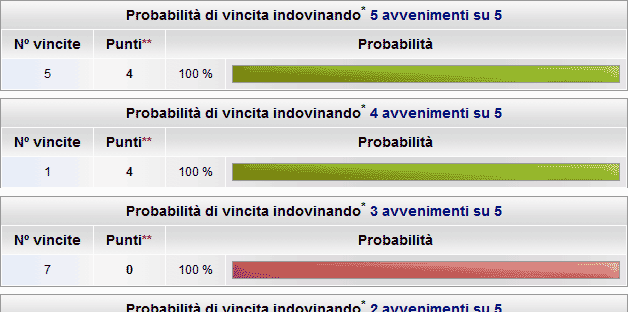 Come mostrato nella seconda tabella relativa ai 4 punti su 5 (indovinando 4 avvenimenti su 5) la probabilità di realizzare una scommessa vincente composta da 4 esiti è del 100%.