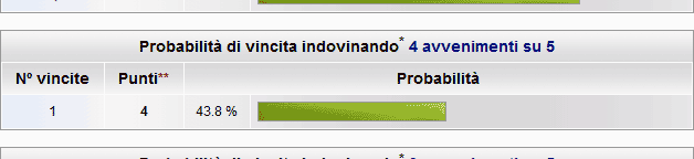 Come si può notare, senza considerare le condizioni (che potrebbero essere corrette o meno) indovinando 4 avvenimenti su 5 la probabilità di avere una scommessa vincente da 4 esiti è del 43.8%.