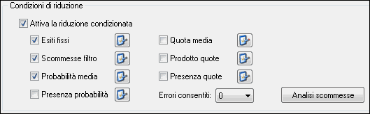 Il secondo passo è quello di decidere quante condizioni una scommessa può non rispettare prima di essere scartata ovvero quanti errori può generare prima di essere scartata (opzione "Errori consentiti"). Una volta impostato questo parametro sarà possibile fare clic sul pulsante "Analisi scommesse". L'analisi delle scommesse consente di avere l'anteprima della riduzione condizionata e di sapere quindi in anticipo quante scommesse rispettano le codizioni impostate: