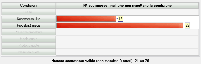 Nell'immagine la riduzione condizionata produrrebbe 21 scommesse finali, delle 70 scommesse appartenenti allo sviluppo integrale 17 non hanno superato la condizione "Scommesse filtro" e 32 la condizione "Probabilità medie". L'ultimo passo sarà quello di avviare la riduzione facendo clic sul relativo pulsante "Avvia riduzione". Segue una breve spiegazione sulle condizioni che è possibile applicare allo sviluppo integrale del pronostico iniziale (per maggiori informazioni fare clic sul nome della condizione):