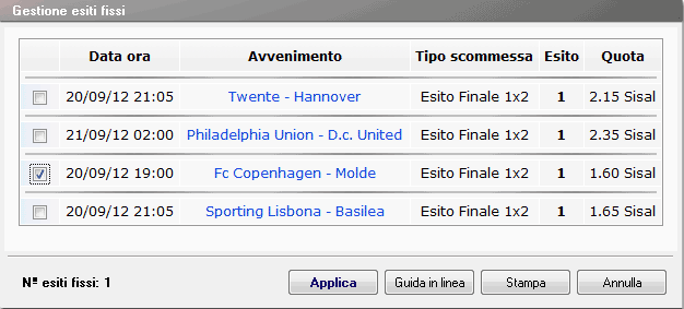 Nell'esempio mostrato in figura è indicato un esito fisso: 1 nella scommessa FC copenhagen - Modle Esito finale 1X2. |