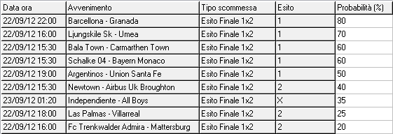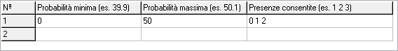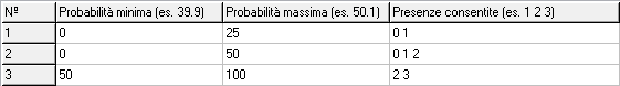Software Scommesse Calcio > Condizione "Presenza probabilità"La probabilità di un esito viene calcolata considerando gli ultimi esiti realizzati dalle squadre secondo i parametri indicati dall'utente tramite nella sezione "Altre opzioni" presente nella scheda "Palinsesto scommesse". Nel caso in cui nel database non siano presenti sufficienti esiti le probabilità saranno calcolate usando la media delle quote degli esiti. Le probabilità percentuali hanno un valore minimo di 0 e un valore massimo di 100. Questa condizione consente di regolare la presenza di determinate probabilità negli esiti dellle scommesse. Per es. supponiamo di voler fare in modo che nelle scommesse siano presenti massimo due esiti con probabilità inferiore al 50%. In questo caso basterebbe inserire una riga con probabilità minima 0 probabilità massima 50 e come presenza consentite 0 1 e 2 (massimo 2 probabilità inferiori a 50):