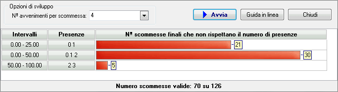 Il pulsante "Anlisi scommesse" consente di verificare l'efficacia dei valori inseriti. Per ogni intervallo sarà riportato il numero di scommesse appartenneti allo sviluppo integrale che non lo rispettano, sarà inoltre rioportato il numero totale di scommesse che hanno superato tutti gli intervalli. Nell'esempio in questione (vedere immagine) 21 scommesse non hanno rispettato il primo intervallo (hanno quindi più di un esito con probabilità inferiore a 25), 30 scommesse non hanno superato il secondo intervallo (perchè presentavano più di 2 esiti con probabilità inferiore a 50), 5 scommesse non hanno superato il terzo intervallo perchè il numero di esiti con probabilità superiori a 50 era diverso da 2 e da 3. Il numero di scommesse valide, che rispettano tutti e 3 gli intervalli è di 72.