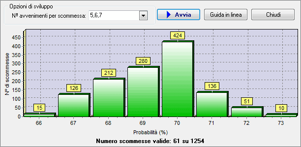 Durante l'elaborazione tutte le scommesse saranno controllate per verificare se la loro probabilità media ricade in uno degli intervalli indicati. Se la probabilità media di una scommessa non ricade in nessuno degli intervalli sarà incrementato di uno il numero di errori che ha generato durante l'elaborazione. Se al termine dell'elaborazione, dopo il controllo delle altre condizioni, la scommessa avrà generato un numero di errori (numero di condizioni non rispettate) superiore al valore indicato nella scheda principale (opzione "Errori consentiti") la scommessa sarà scartata. Il pulsante "Anlisi scommesse" consente di verificare quante scommesse supereranno la condizione ovvero in numero di scommesse appartenneti allo sviluppo integrale aventi una probabilità media che ricade in uno degli intervalli inseriti. Il grafico mostra la distribuzione delle probabilità nelle scommesse ovvero per ogni valore di probabilità (da 0 a 100, asse orizzontale) viene visualizzato il numero di scommesse che ha tale probabilità media (troncate, solo per la visualizzazione del grafico, al valore intero, es. 69,83 % diventa 69%). Per es. considerando l'immagine 424 scommesse hanno una probabilità media del 70% (maggiore o uguale a 70 e inferiore al 71), 51 scommesse hanno una probabilità media del 72 (maggiore o uguale a 72 e inferiore a 73).