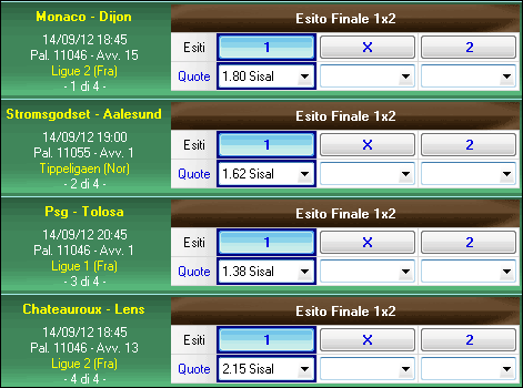 Per meglio comprendere i parametri visualizzati nella scheda di riduzione si consideri il seguente pronostico composto da 4 esiti pronosticati in 4 scommesse relative a 4 avvenimenti con quote che vanno da 1.38 a 2.15.