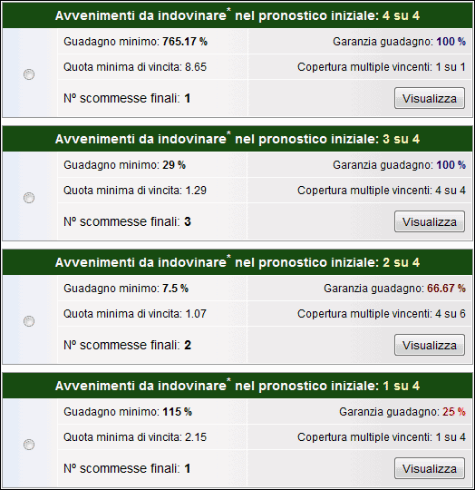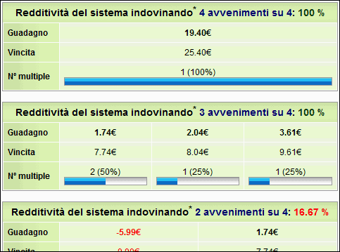 Indovinando 3 avvenimenti su 4 il sistema garantisce al 100 % un guadagno che va da 1.74 euro a 3.61 euro. Indovinando 4 avvenimenti su 4 si vincerebbero 25,40 euro con un guadagno al 100 % di 19,40 euro. Indovinando 2 avvenimenti su 4 si avrebbe solo il 16 % di probabilità di realizzare un guadagno positivo (1,74 euro).
