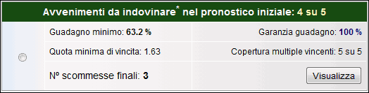 il numero di avvenimenti da indovinare affinché il guadagno sia garantito. E' il numero di avvenimenti del pronostico iniziale che si pensa di indovinare, nell'esempio mostrato il numero di avvenimenti da indovinare è 4. Se per un avvenimento si inseriscono scommesse di diversi tipi sarà comunque sufficiente indovinare l'esito di una qualunque delle scommesse inserite, non sarà necessario indovinare tutte le scommesse dell'avvenimento. Per es. nell'avvenimento Cagliari - Udinese inserendo sia esito finale 1X2 (esito 1) che doppia chance (esito X2), sarà sufficiente indovinare anche uno solo dei due esiti pronosticati infatti le due scommesse appartengono allo stesso avvenimento.