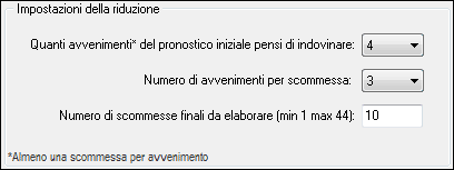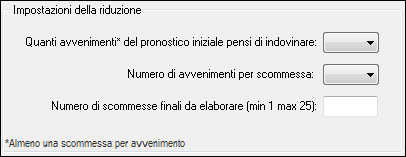 Software Scommesse Calcio > Riduzione a massima rappresentativitàLo scopo della riduzione a massima rappresentatività è quello di creare un sistema contenente un determinato numero di scommesse finali aventi la caratteristica di garantire il maggior numero possibile di vincite. Il procedimento è simile a quello della riduzione a punteggio garantito ma in questo caso invece che fissare il numero di scommesse vincenti l'utente può fissare il numero di scommesse finali da giocare. Sarà il software a estarre dal pronostico iniziale il numero desiderato di scommesse più rappresentative ovvero quelle che garantiscono il maggior numero possibile di vincite. I parametri che è possibile definire sono: