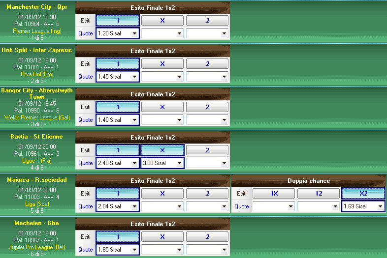 Si consideri, come esempio, il seguente pronostico iniziale composto da 8 esiti pronosticati in 7 scommesse relative a 6 avvenimenti con quote che vanno da 1.20 a 3.00.