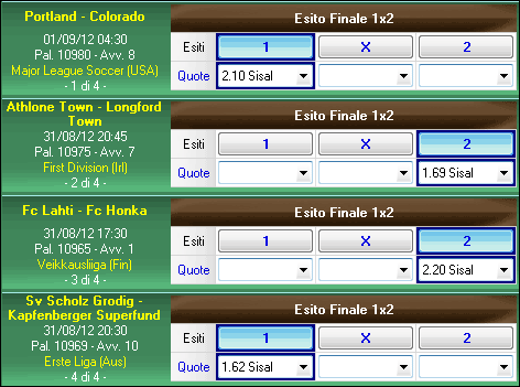Si consideri, come esempio, il seguente pronostico composto da 4 esiti pronosticati in 4 scommesse relative a 4 avvenimenti con quote che vanno da 1.62 a 2.20.
