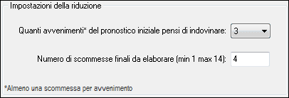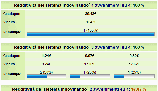 In questo caso indovinando 3 avvenimenti su 4 il sistema garantisce al 100 % un guadagno che va da 1.24 euro a 9.62 euro. Alla riduzione a massima redditività può essere applicata anche la riduzione condizionata. Nella pagina relativa agli esempi sarà possibile visualizzare altri esempi di sistemi ridotti a massima redditività. |